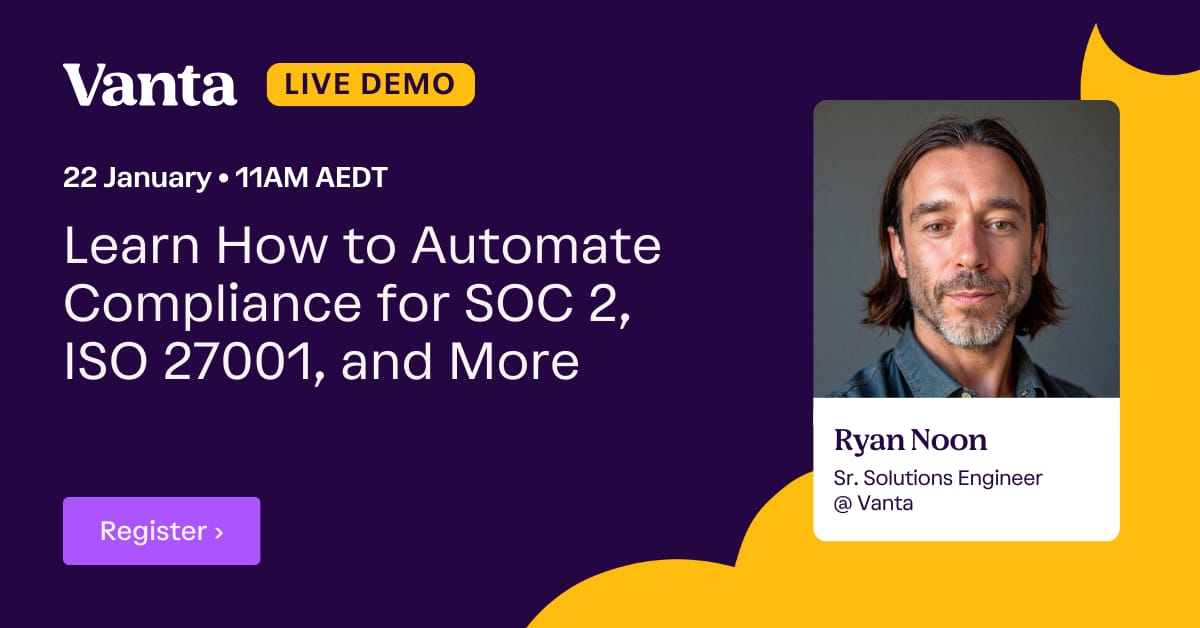Plus, you’ll get a live walkthrough of the Vanta platform, followed by an interactive Q&A.