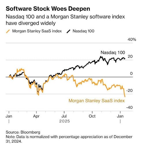 📉 A global sell-off in software stocks has reignited fears that AI agents could undermine the economics of traditional SaaS, after the release of Anthropic’s Claude Cowork triggered the worst start to the year for SaaS stocks since 2022. (Capital Brief) Locally, Atlassian shares have falled 16% since Cowork was launched on Jan 12th. Bloomberg has more.